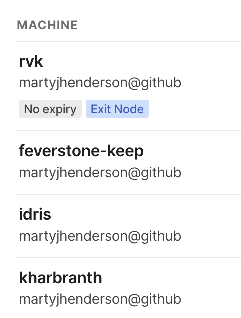 Since they were all networked, I could connect to Idris by simply going ssh mjh@idris and the MagicDNS feature would alias the internal IP (something like 10.100.x.x) to a name - and let me continue to log in. It's pretty slick for both aliases and not traversing the world to connect to my various machines. A few more settings and you cannot connect to my boxes without being on my Tailnet - unless you are on my network, https://tones.nalth.is/ doesn't actually connect to anything.