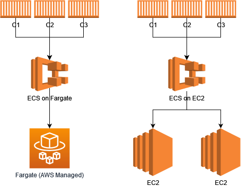 The difference between running three containers on Fargate and running three containers on EC2 (through ECS) is who is managing the Compute power. My little diagram below shows the difference between serverless (on the left) and not serverless (on the right). In the not serverless version, I would be deciding on sizes of the EC2 instances and manging when they break or need to scale.
