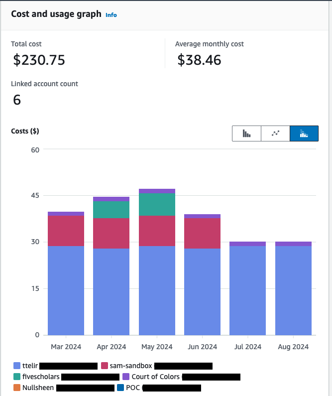 This chart is my actual costs broken up by my 6 accounts that all get used for different things. It's pretty easy to see, quickly, that my POC account uses around $30/mo, but Nullsheen costs me practically nothing.